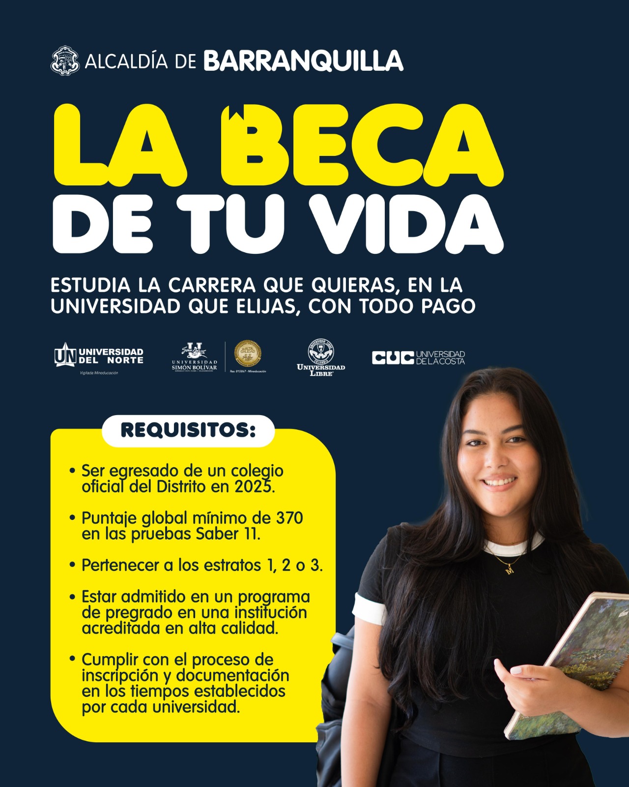 La Alcaldía de Barranquilla abrió la convocatoria del programa “La Beca de tu Vida”, una iniciativa que busca garantizar el acceso a la educación superior de los estudiantes egresados de colegios oficiales del Distrito. Con este beneficio, los jóvenes podrán cursar la carrera de su elección en universidades acreditadas en alta calidad, con matrícula totalmente financiada.