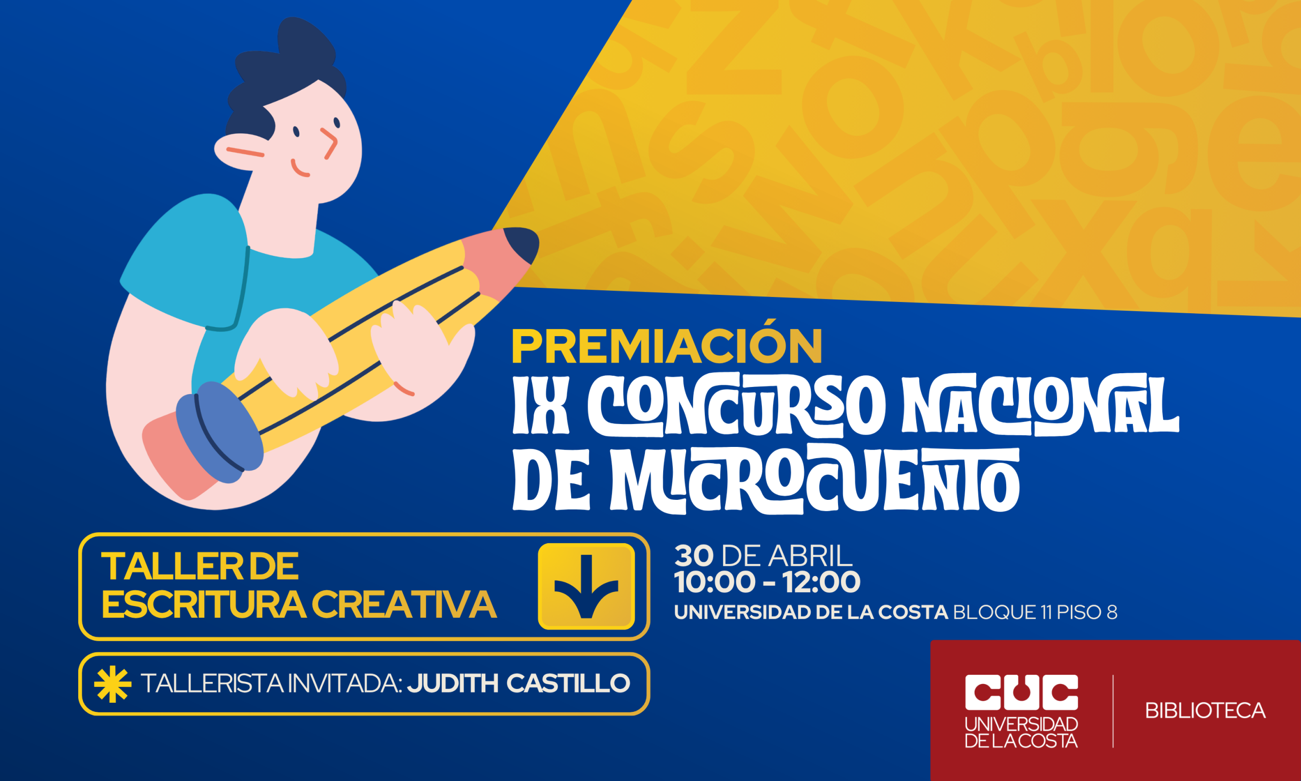 La Biblioteca de la Universidad de la Costa invita a toda la comunidad educativa y al público en general a la ceremonia de premiación del IX Concurso Nacional de Microcuento, que se llevará a cabo el jueves 30 de abril a las 10:00 a. m. en el Salón de Fundadores (Bloque 11, piso 8). Durante el evento, se darán a conocer los ganadores del primer, segundo y tercer lugar de esta edición.