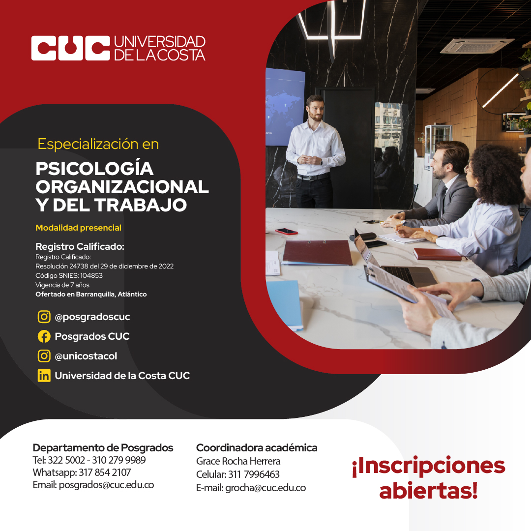 El Especialista en psicología Organizacional y del Trabajo de la Corporación Universidad de la Costa, Estará en capacidad de desempeñarse como: Director de gestión del talento humano en organizaciones públicas o privadas. Jefe de Selección de personal. Director de Bienestar Laboral. Jefe de Bienestar Laboral. Director de formación, Desarrollo personal y Entrenamiento. Jefe de Formación. Consultor y asesor en procesos de entrenamiento y desarrollo de personal. Consultor y asesor la gestión del cambio organizacional.