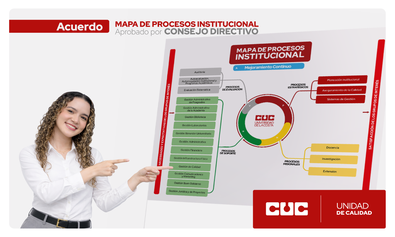 La Universidad de la Costa informa a toda su comunidad académica y administrativa que, mediante el ACUERDO No. CD – 690 del 26 de noviembre de 2025, el Consejo Directivo aprobó la modificación del Acuerdo No. 370 del 31 de octubre de 2012, a través del cual se actualiza el Mapa de Procesos Institucional.