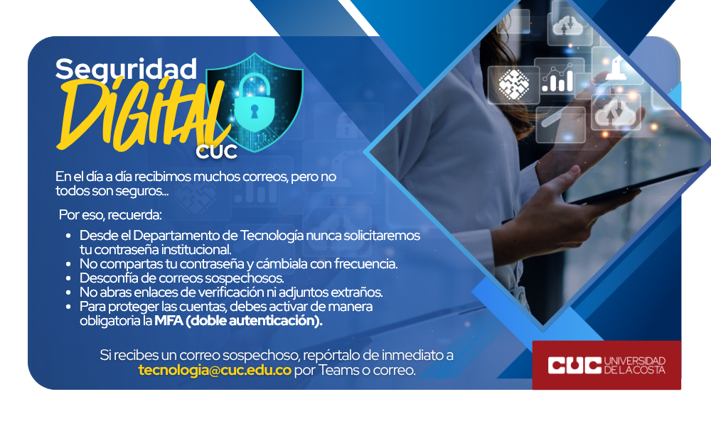 Si recibes un correo que lo haga, no lo respondas ni abras enlaces. Recuerda: protege tus cuentas activando la MFA (doble autenticación) y cambia tu contraseña con frecuencia. Reporta cualquier mensaje sospechoso a tecnologia@cuc.edu.co