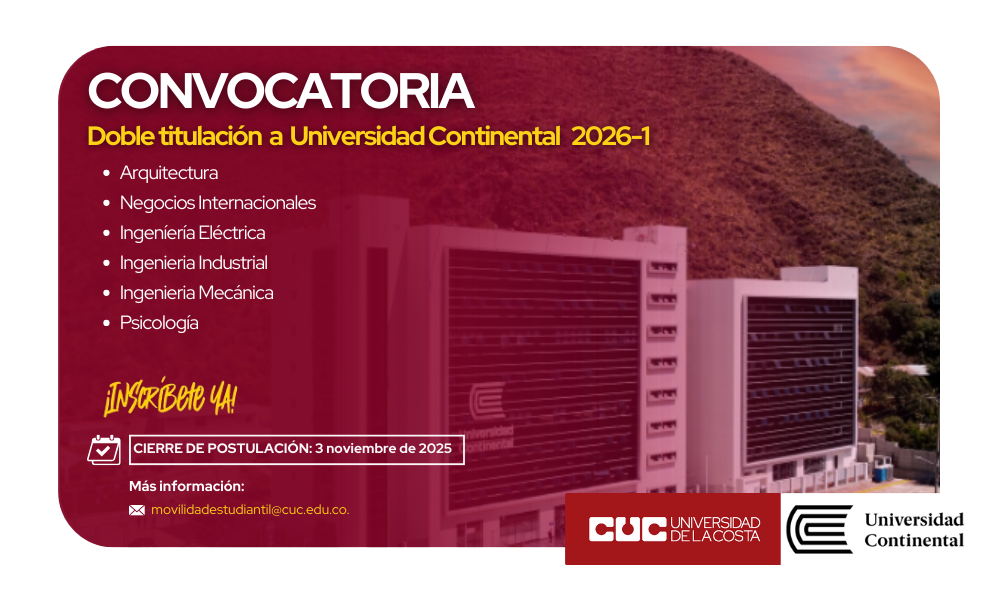El departamento de Internacionalización se complace en anunciar la apertura de la Convocatoria de Doble Titulación para seleccionar estudiantes de programas de pregrado de la Universidad de la Costa que deseen participar en el Convenio de Doble Titulación con la Universidad Continental (Perú) durante los periodos 2026-1 a 2026-2.