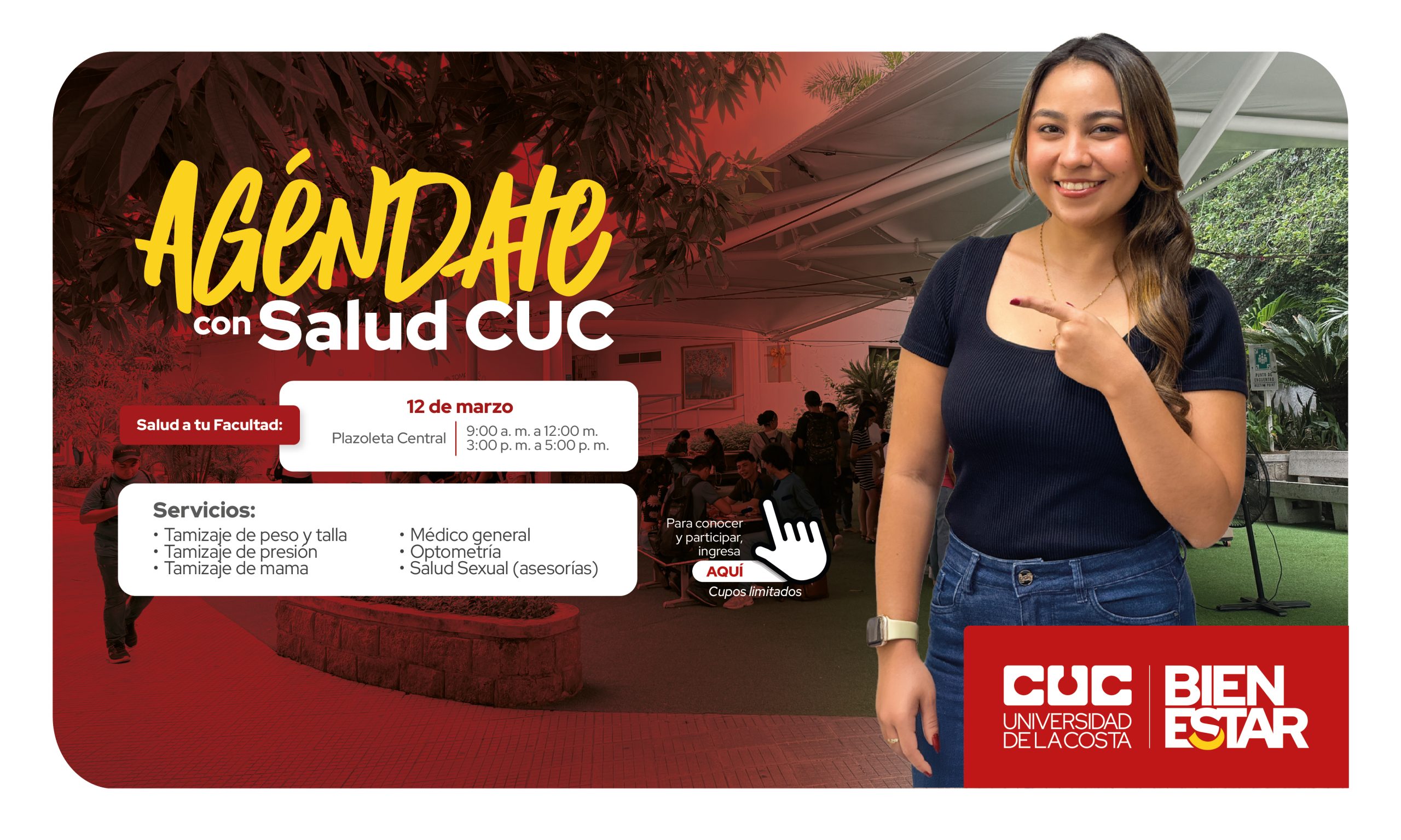 Desde la Vicerrectoría de Bienestar Universitario a través de la Coordinación de Salud Integral queremos invitarte a participar de los siguientes servicios que tenemos para ti en este mes de marzo.