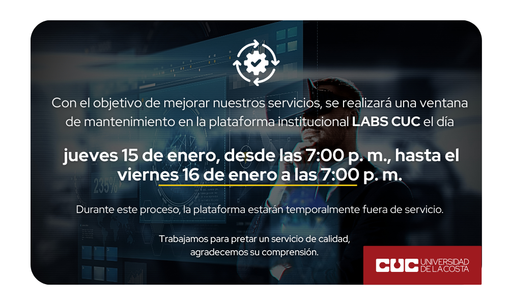 Con el objetivo de mejorar nuestros servicios, se realizará una ventana de mantenimiento en la plataforma institucional LABS CUC el jueves 15 de enero, desde las 7:00 p.m., hasta el viernes 16 de enero a las 7:00 p.m. Durante este periodo, la plataforma estará temporalmente fuera de servicio.