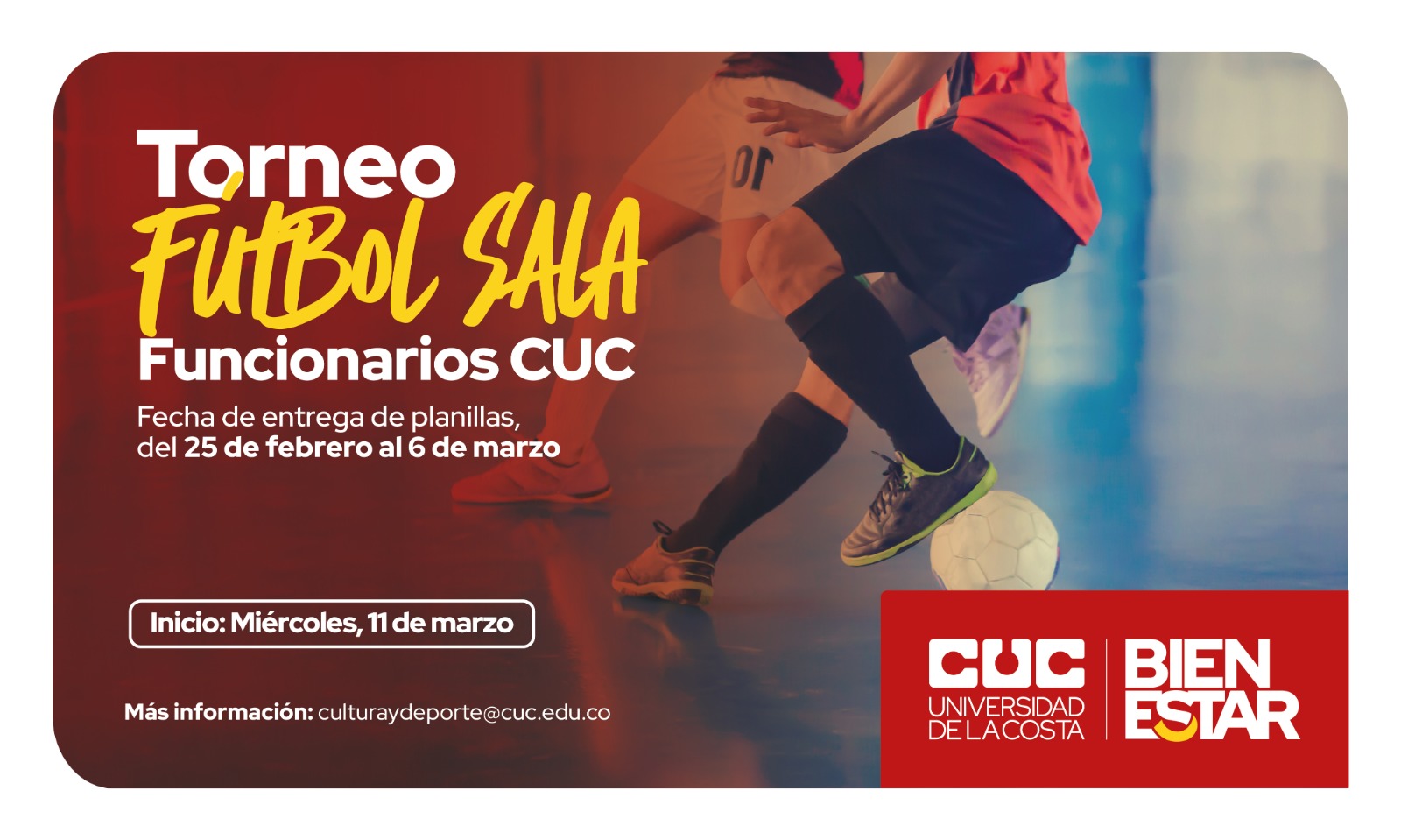 Bienestar Universitario los invita a ser parte del torneo de fútbol sala funcionarios CUC, un espacio para compartir, integrarse y vivir la pasión por el deporte en nuestra comunidad institucional.