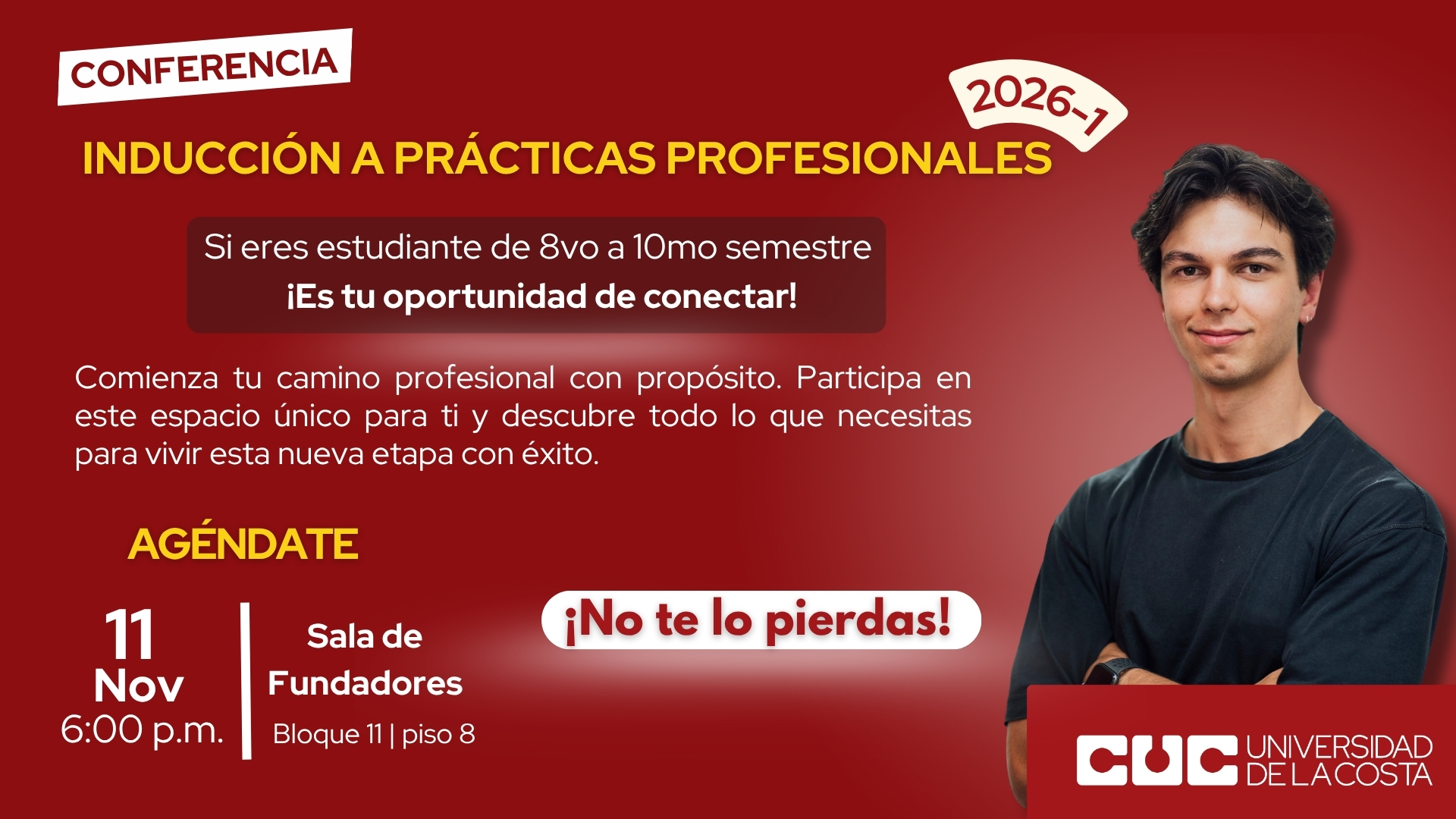 El día de hoy, 11 de noviembre, la Universidad de la Costa lleva a cabo la conferencia “Inducción a Prácticas Profesionales 2026-1”, un espacio pensado para los estudiantes de 8vo a 10mo semestre que están próximos a iniciar una de las etapas más importantes de su vida universitaria: las prácticas profesionales.