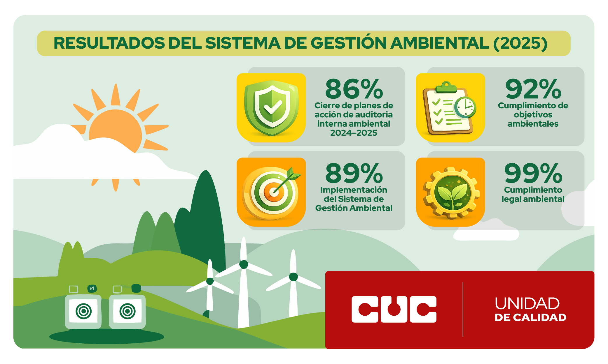 Desde la Unidad de Calidad se permite socializar a la comunidad universitaria los resultados del Sistema de Gestión Ambiental 2025 que evidencian el compromiso de la institución con la mejora continua y la sostenibilidad.